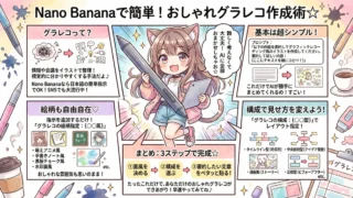 Nano Bananaでグラレコ風イラストを作る方法を解説。基本プロンプト、要約内容の入力方法、画風指定、構成パターンまで具体例付きで整理しています。文章をそのまま貼るだけで図解化する手順を知りたい方に向けた実用ガイドです。
