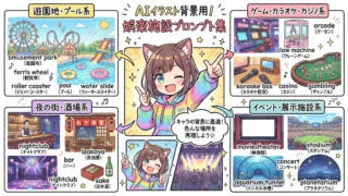 AIイラストの背景に使える娯楽施設のプロンプトを一覧でまとめました。遊園地、プール、ゲームセンター、カラオケ、映画館、スタジアム、水族館など、施設ごとに整理して掲載。背景の場所を具体的に指定したいときに、そのまま使える形で確認できます。シーンに合った背景を効率よく設定したい方に向けた内容です。