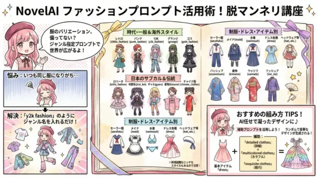 NovelAIで使える服装・ファッション系プロンプトを、ジャンル別に一覧でまとめました。時代別スタイル、日本のサブカル系、制服、水着、ドレスなど幅広く網羅。服装がワンパターンになりがちな人でも、名前を選ぶだけでイラストのバリエーションを増やせます。NovelAIが実際に認識する服装名を掲載しています。