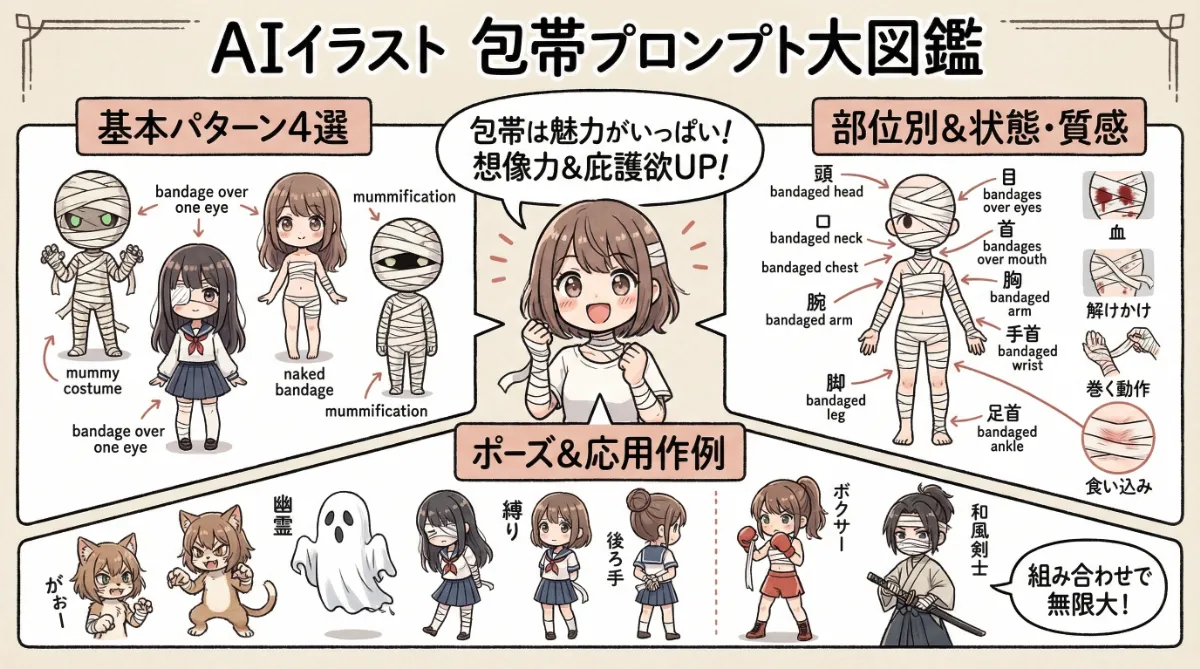 そこで今回は、包帯を巻くプロンプトについて、基本的なものから、より魅力的に使うための組み合わせまで、整理して紹介していきます