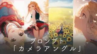 作例のように「天井を見上げるアングル」、「天井から見下ろすアングル」のプロンプトがあります。