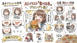 なお食べる・食事シーン関連のプロンプトは以下の記事にて紹介しています。合わせてご活用ください。