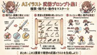 なお以下の記事にて武器に関するプロンプトを体系的に紹介しています。興味のある方はぜひこちらもご活用ください。