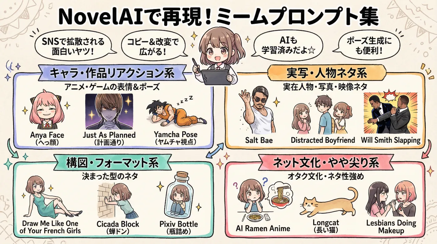 また、様々なNovelAI用のポーズを体系的にまとめたプロンプトを以下の記事にて紹介しています。