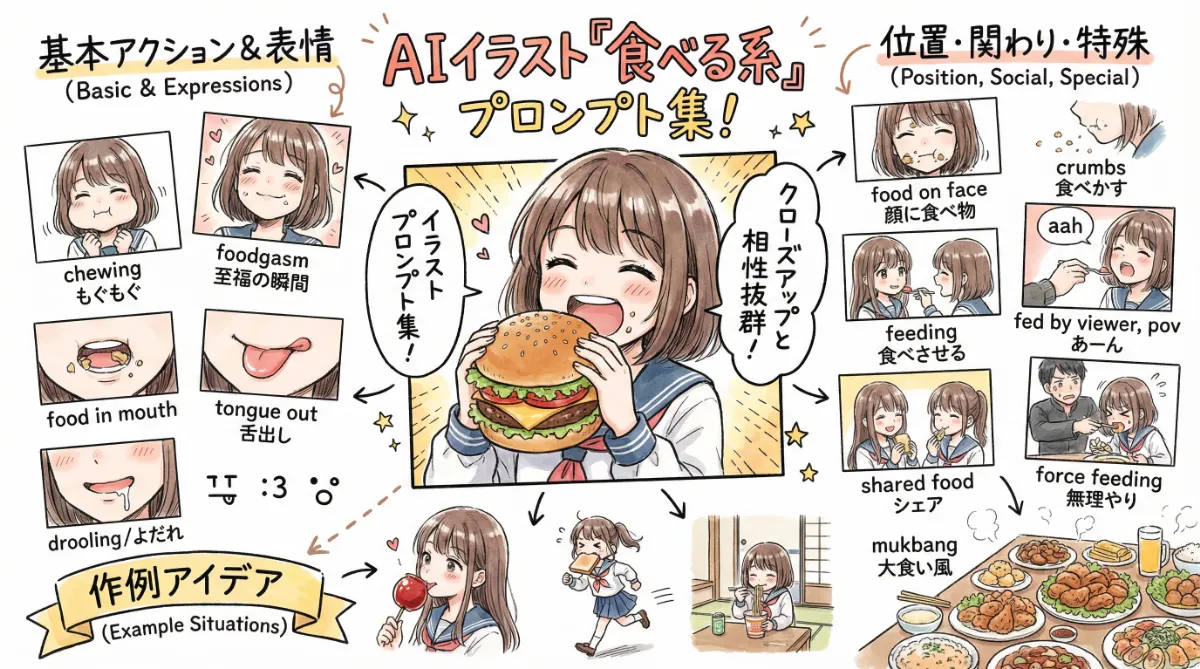 それぞれのコスプレには、画像一覧(カタログ)を用意しており、その下に対応するプロンプトの一覧表を掲載しています。