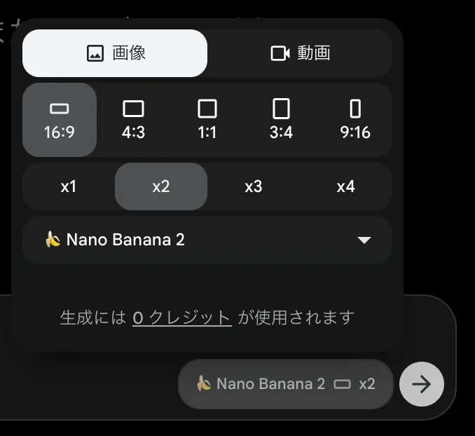 あと、たまにNano Banana Proのクレジット消費が50%オフになるキャンペーンもあります。通常2クレジットのところが1クレジットになるので、こういうタイミングでまとめて使う、というやり方もありだと思います。