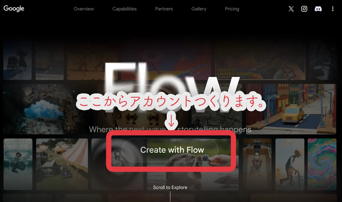 まずは「Google Flow」にアクセスしてみましょう。「Create with Flow」を選択して画面遷移していきます。
