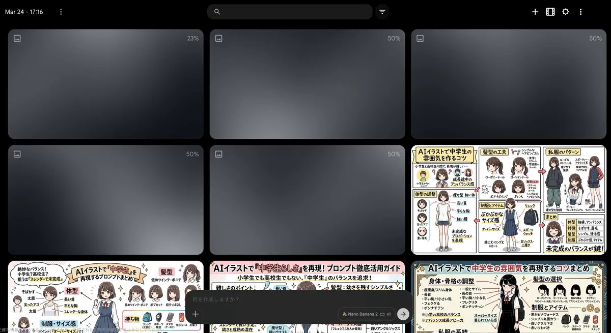 Nano Banana Proは無料プランだと20枚/日までという制限があるので、どちらにせよそんなにたくさんキューを入れることはできないのですが、、Nano Banana 2は制限をあまり気にせず使える感じなので、かなり気楽にバンバン生成できます。