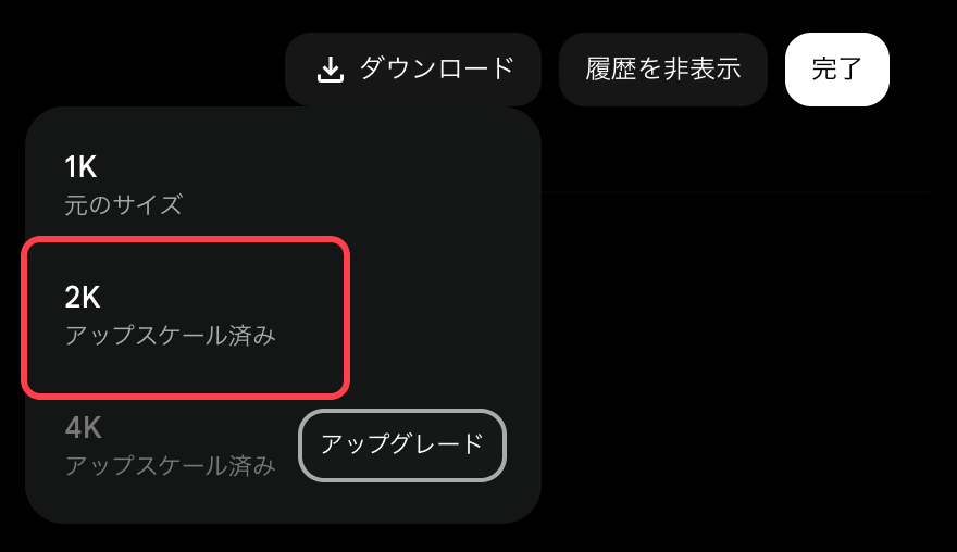 結論から言いますと、画像は全て1Kで生成されるのですが、ダウンロード時に2Kを選択できます。アップスケールされた画像内で、文字の崩れが修正されていました。