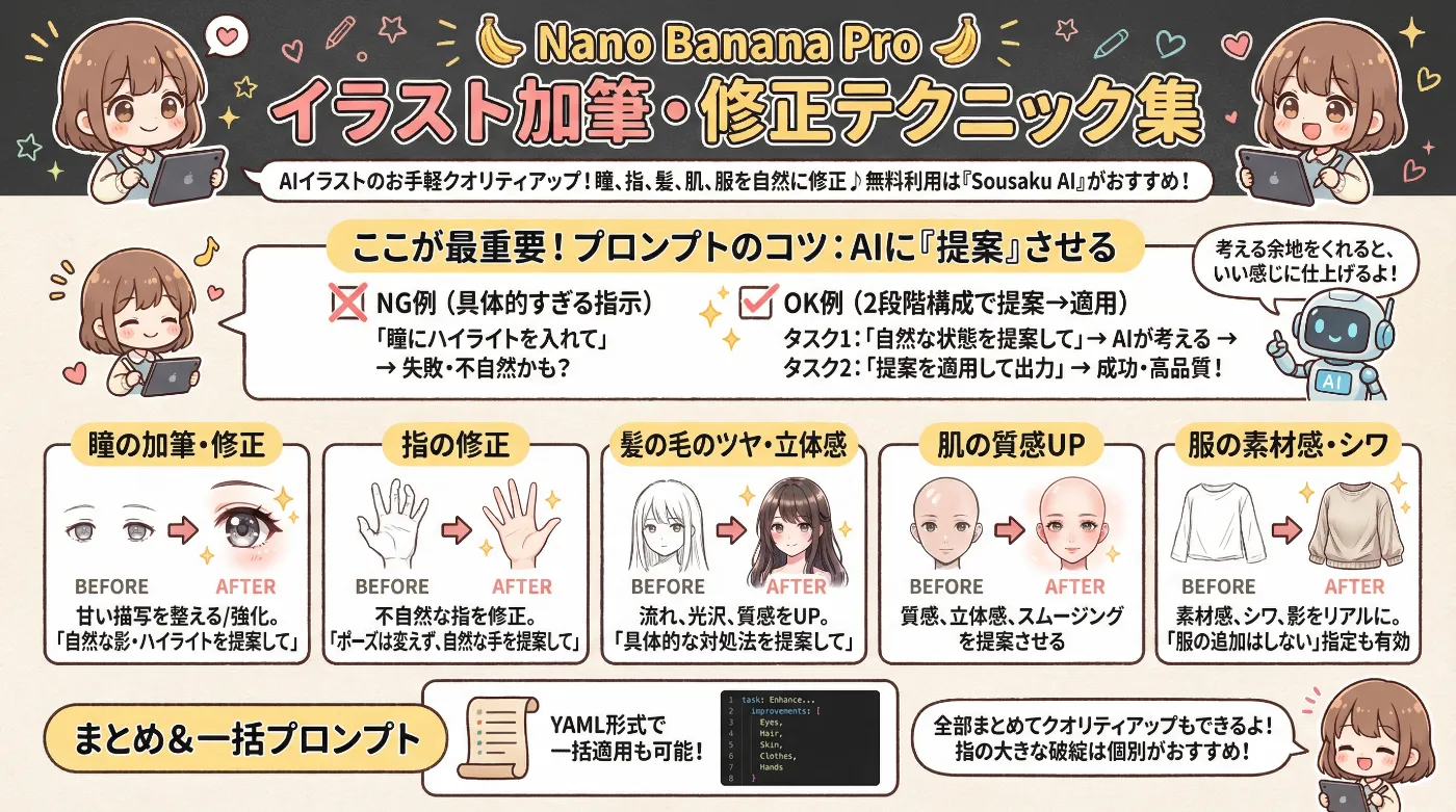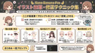 以下の記事にて、Nano Banana Proを活用したAIイラストの加筆修正テクニックを紹介しています。そのまま使えるプロンプトを掲載していますので、ぜひご活用ください。