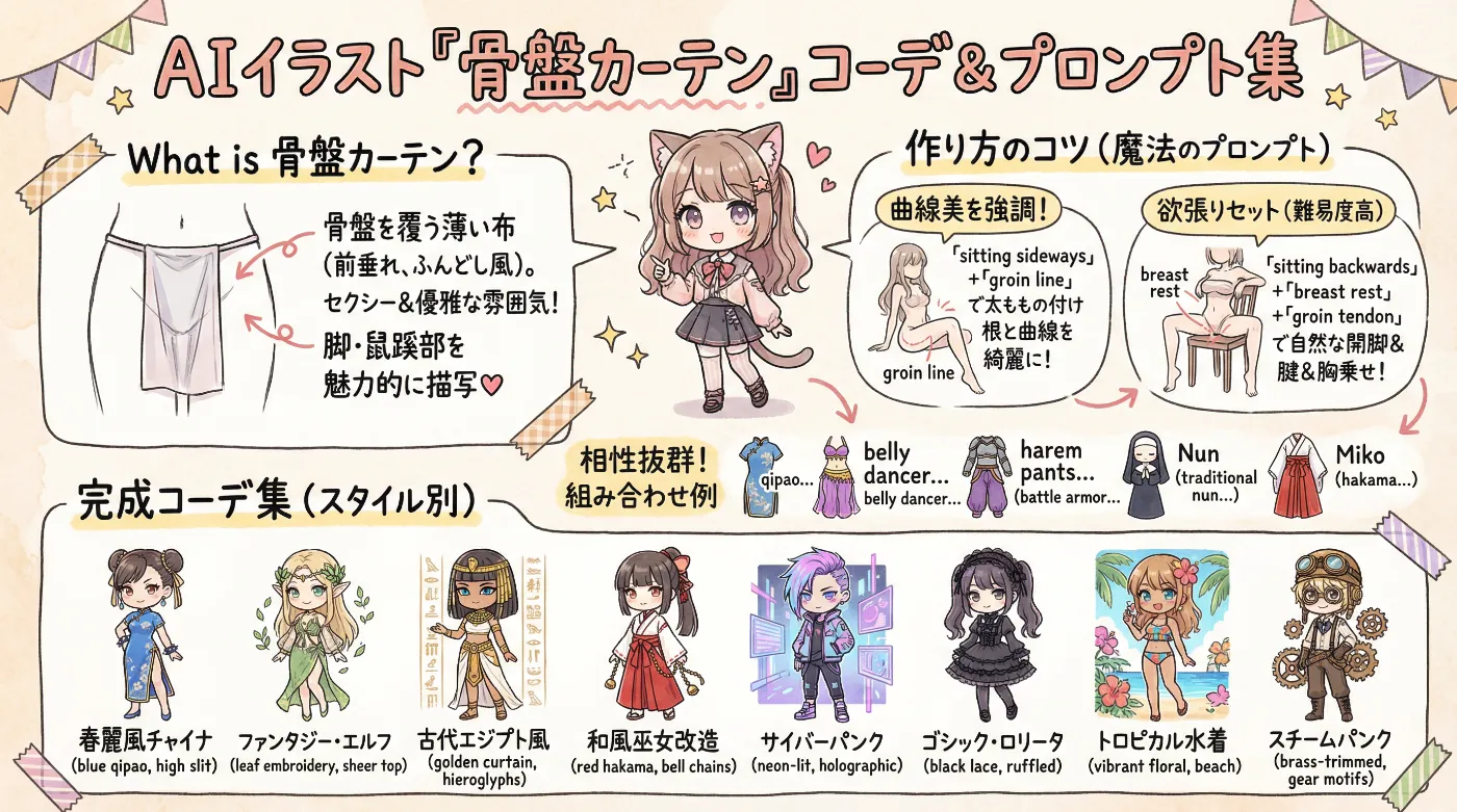 本記事では、AIイラストで骨盤カーテンを使った服のコーデプロンプトを紹介しています。